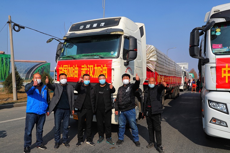 2月3日下午1點(diǎn),在山東濰坊308國道與羊田路交叉路口,10輛中國重汽汕德卡、豪沃整裝待發(fā),車上滿載濰柴動(dòng)力捐贈(zèng)武漢疫區(qū)的首批200多噸新鮮優(yōu)質(zhì)蔬菜。